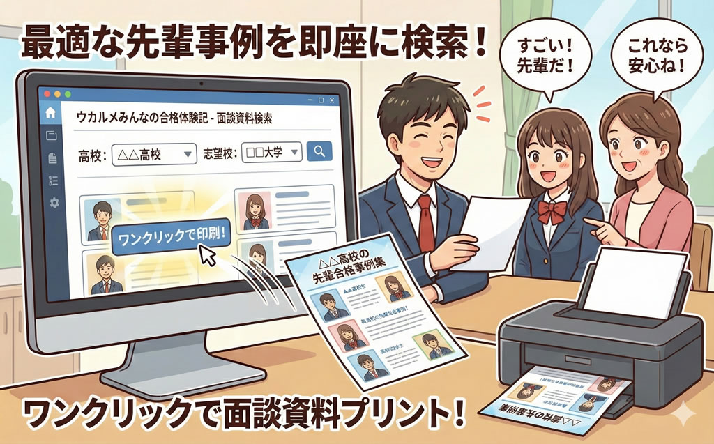 ウカルメみんなの合格体験記を使えば、過去のデータベースから最適な先輩の事例を検索してワンクリックで面談資料をプリントアウトできます。