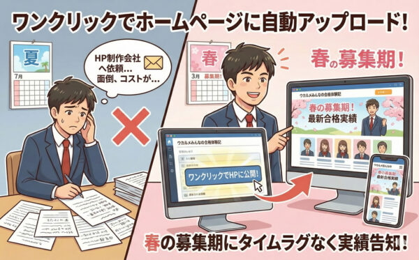 「合格しました!」の喜びを、その瞬間に、あなたの塾のホームページへ。 ホームページの更新、業者に頼むと面倒ですよね? ウカルメなら、管理画面で「OK」ボタンを押すだけ。写真付きの合格体験記が、あなたの塾のホームページに自 […]
